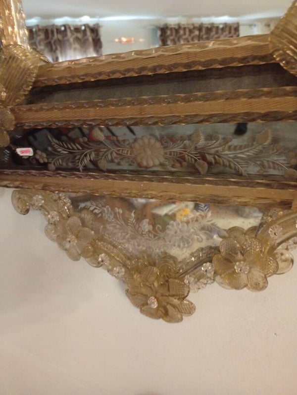 Espejo veneciano con aplicaciones en cristal de Murano en tonos dorados y viseles gravados al ácido con motivos florales. Primera mitad del siglo XX
