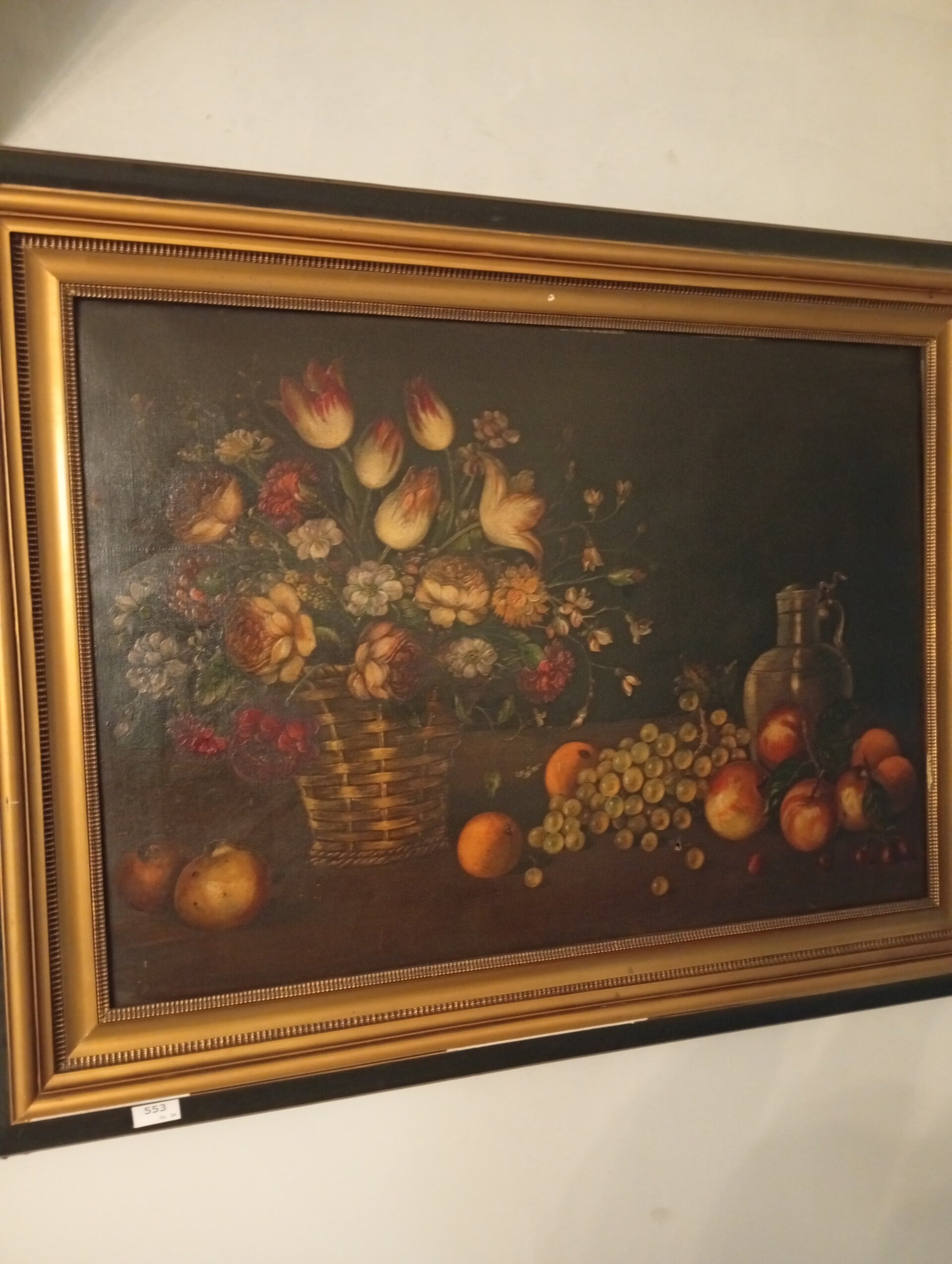 Preciosa pintura al óleo sobre lienzo, representando bodegon español de principios del siglo XX. Se encuentra en marco dorado.