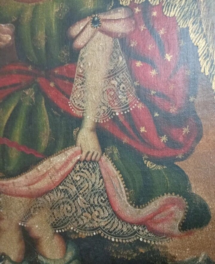 Pintura de un arcángel de estilo cuzqueño, con detalles de la época colonial.